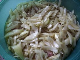 Die Zwiebeln werden geschдlt und in Ringe geschnitten. Nun werden alle Zutaten gut miteinander vermischt und zum Schluss das Цl hinzugefьgt. Das Fleisch wird darin eingelegt. Das Fleisch muss einige Stunden marinieren, am besten ьber Nacht.