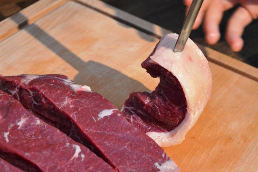 Wer andersherum einsticht, hat die Fettseite auf dem Grill größtenteils nach unten liegen und riskiert ein stärkeres Verbrennen. Ich achte außerdem darauf, dass die einzelnen Stücke eng aneinander liegen. Somit erhitzt sich später der Spieß nicht so stark, was auch das Fleisch innen zu schnell zum Garen bringen würde. Mit etwas mehr Handarbeit kann man aber auch ein Tafelspitz grillen, das nicht ganz richtig eingestochen wurde. 😉