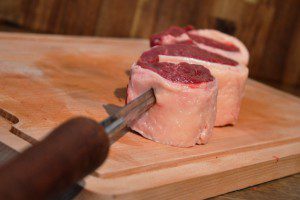 Weil die Muskelfasern zu Lebzeiten des Tieres stark beansprucht wurden, ist der Tafelspitz relativ zäh. Dadurch ist der Zuschnitt sehr wichtig. Auf der Seite ohne Fettdeckel können wir den leicht schrägen Verlauf der Muskelfasern sehen und setzen die Schnitte um 90° versetzt an, wie auf dem Bild zu sehen ist. Dadurch dass später mehr oder weniger kleine Scheiben vom Fleisch geschnitten werden, ist die Länge der schwer kaubaren Faser sehr kurz. Deswegen lösen sich die einzelnen Fasern voneinander und das Kurzgebratene ist “zart”.