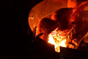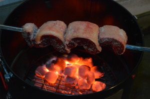 Die Fleischstücke werden dann gesalzen und über offenes Feuer gehalten, ich mache das immer mit zwei direkten Zonen außen und einer indirekten Zone in der Mitte des Grills. Beim proQ WSM kann ich die einzelnen Etagen des Grills nutzen, um die Strahlungswärme der Glut zu reduzieren und ein Verbrennen so zu verhindern. Das sieht man auch auf den Fotos. Ich beginne dennoch zuerst mit dem direkten Aufheizen des zur Glut geneigten Fettdeckels, bis das erste Fett heraustropft und die Flammen hochschlagen. Dann drehe ich den Fettdeckel nach oben und schiebe den Spieß in den indirekten Bereich, sodass die Hitze an den Schnittseiten vorbeiströhmt. Das herunterfließende Fett des Deckels bildet dann eine tafelspitzenmäßige Kruste. 😉